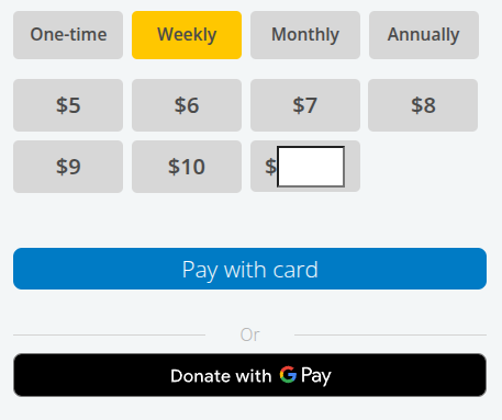 amounts=URL parameter, which allows you to customize the amounts shown to a user on an NGP VAN Payments donation pages. Now you can also show different amounts for recurring donations than you do for one-time donations, with theweekly_amounts,monthly_amounts, andannual_amountsURL parameters. These work exactly the same as theamountsURL parameter.Using one of these new URL parameters will remove the "Make it monthly" checkbox and replace it with a button above your Amount picker that lets users choose the frequency of their donation, like this: