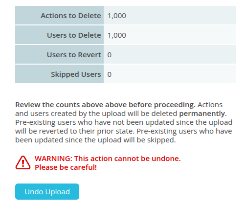 Note: If you uploaded more than one file containing the same users, and you want to undo them, it is important to undo the file in reverse order, starting with the most recent upload.