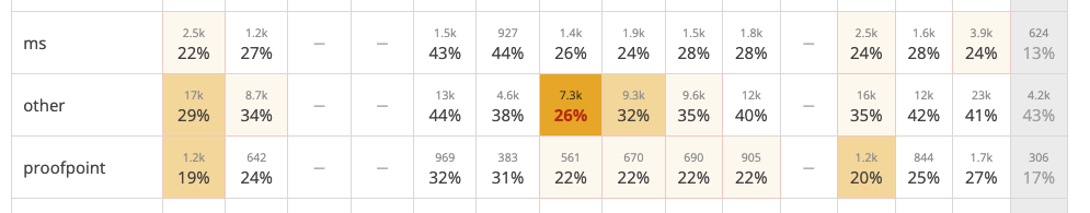 mswill continue to refer to Hotmail, Outlook, and Live domain names, andoffice_365will cover work and university domains using Office 365. We've seen Office 365 make different filtering decisions from Microsoft's consumer domains, so we think it's worth considering them separately in reports and targeting.