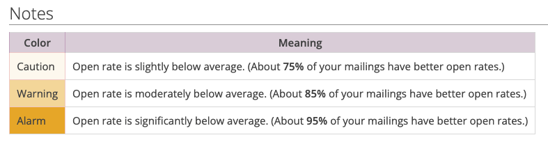 Finally, the contents of the new report are improved. Your open rates are compared to your historical performance by default instead of applying static thresholds. This will reduce the likelihood of false alarms, as well as give you a much clearer view of how your mailings are performing.